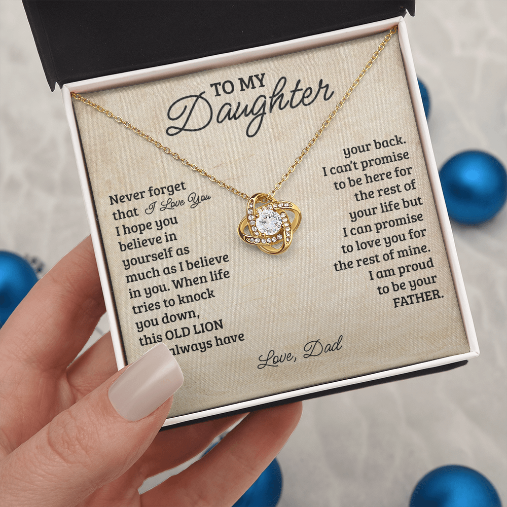 This isn't just a shiny new thing. When she opens the box and sees the shimmering knot—a stunning symbol of two souls forever entwined—that is only the beginning. The real moment hits when she lifts the heartfelt message card. That personalized card speaks directly to her soul, reminding her that she is brave, she is strong, and she is loved more than she knows. Every time she wears this necklace, she feels your warmth, your pride, and the unbreakable connection that only a father and daughter share.